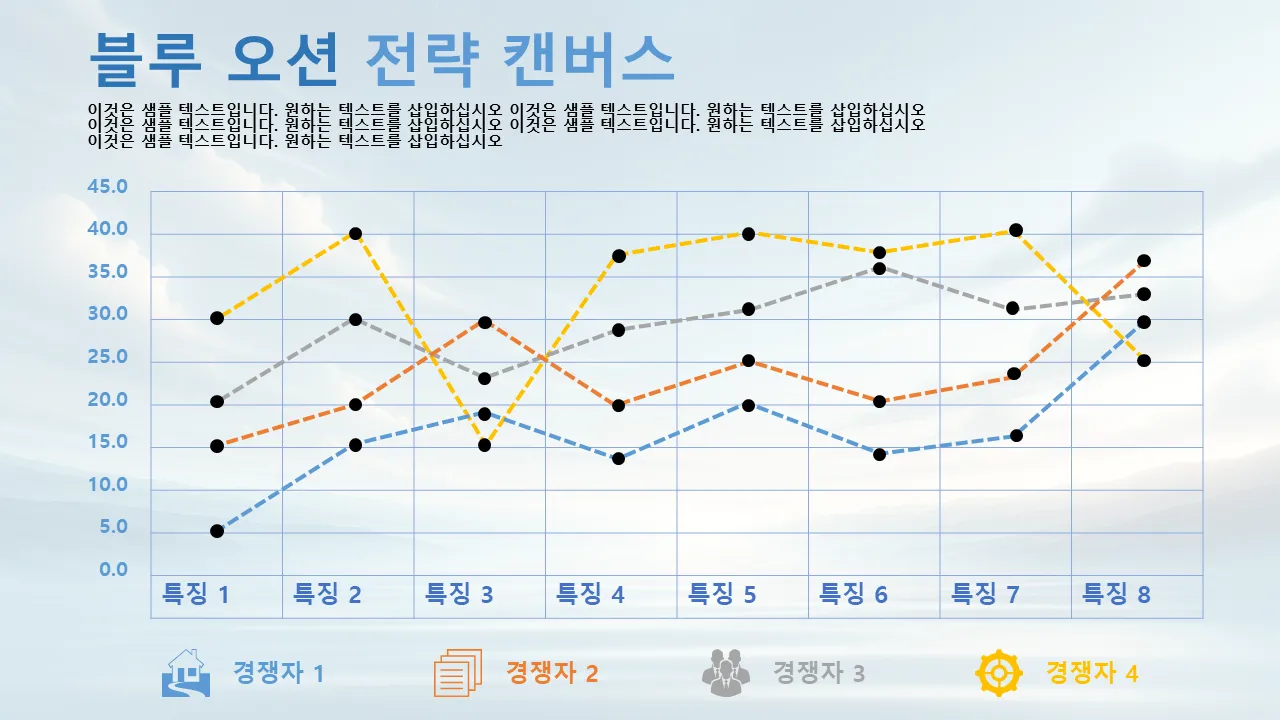 비즈니스 성장 프레젠테이션을 위해 디자인된 시각적으로 매력적인 블루 오션 전략 캔버스 템플릿입니다. 전략 계획, 시장 차별화 및 경쟁 분석에 적합합니다. 지금 다운로드하세요.