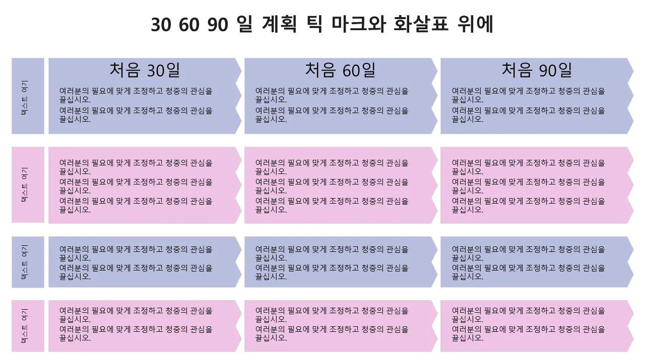 진행 상황을 추적하기 위한 시각적 눈금 표시와 화살표가 있는 전문적인 30 60 90일 계획 PowerPoint 템플릿입니다. 비즈니스 전략, 프로젝트 일정 및 경영진 계획에 이상적입니다. 지금 다운로드하세요.