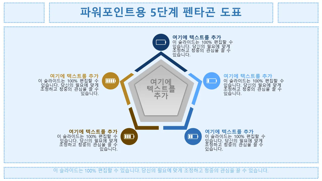 전략적 계획, 비즈니스 로드맵 및 프로세스 워크플로에 이상적인 시각적으로 매력적인 5단계 오각형 다이어그램 PowerPoint 템플릿입니다. 편집 가능하고 전문적이며 프레젠테이션 준비가 되어 있습니다.