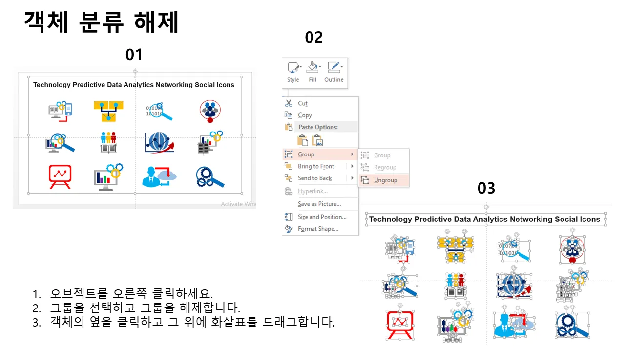 - 작은 인포그래픽 및 대형 프레젠테이션 슬라이드 모두에 맞게 확장 가능한 아이콘