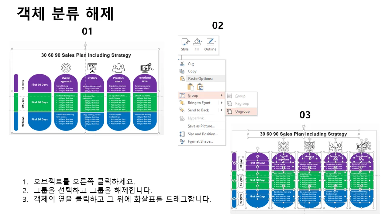 - 30 60 90일 계획을 위한 세 가지 별도의 시간 단계 섹션