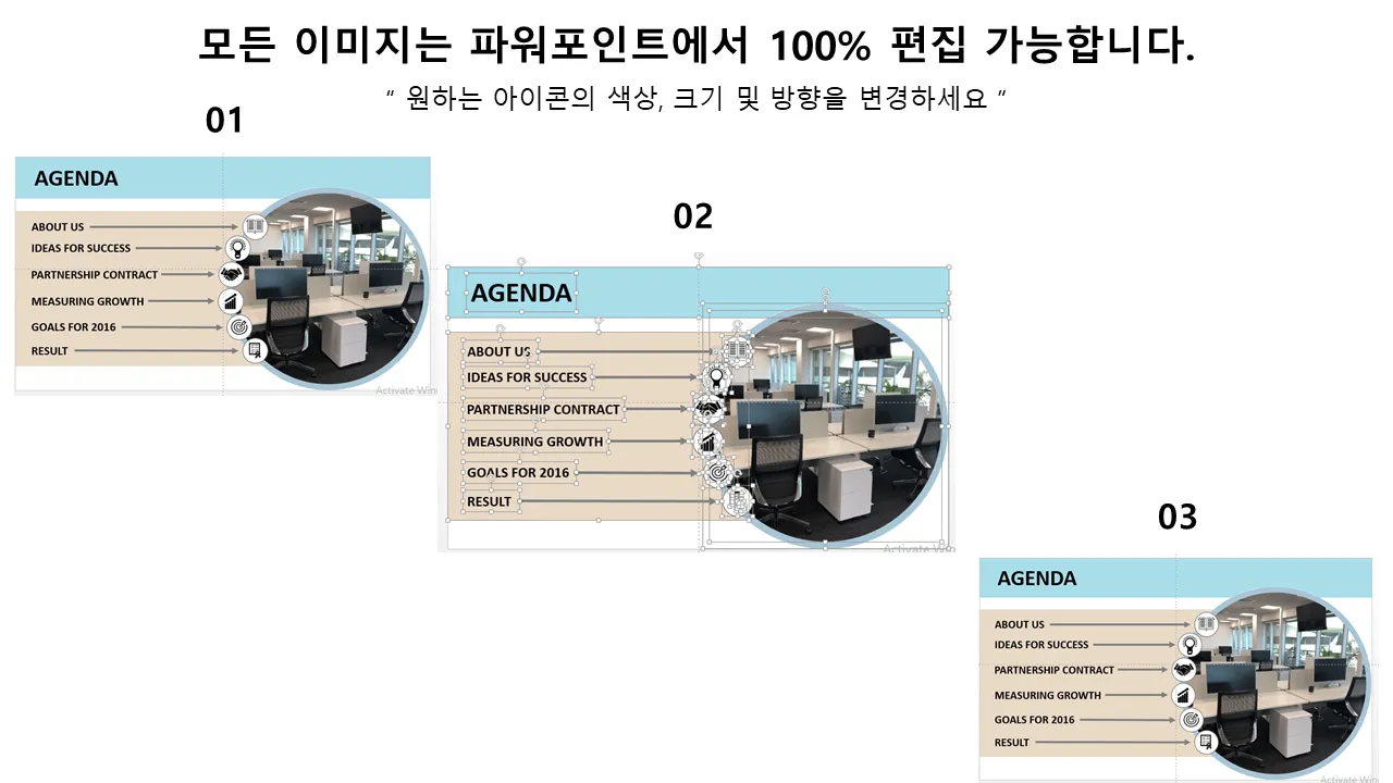아이콘 파워포인트 슬라이드가 있는 컷 이미지가 있는 의제 템플릿 디자인의 특징
