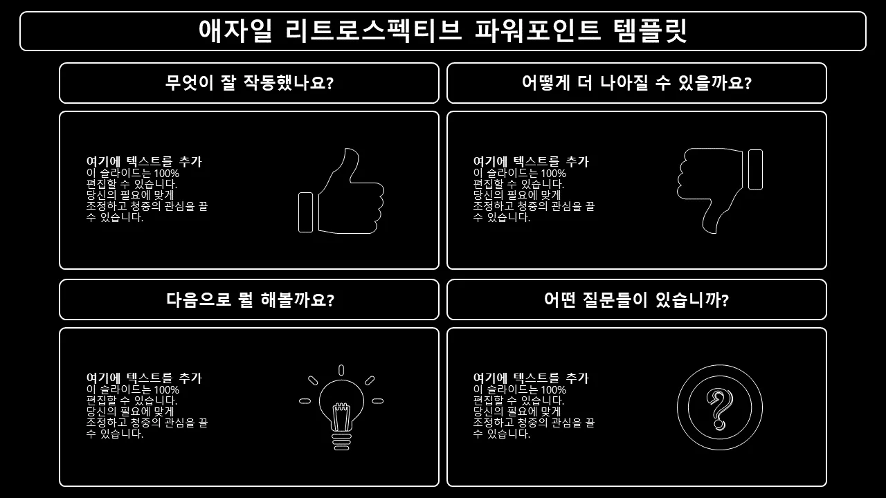 소프트웨어 개발, 제품 관리 및 프로젝트 기반 역할을 담당하는 팀은 이 템플릿을 사용하여 지속적인 개선을 촉진하는 정기적인 회고를 수행합니다. Agile 방법론이 구현되는 기술 스타트업, SaaS 회사 및 엔터프라이즈 IT 부서에서 잘 작동합니다. 관리자와 진행자는 피드백과 결과에 초점을 맞춘 깔끔한 디자인의 이점을 누릴 수 있습니다. 템플릿은 스프린트 검토, 팀 온보딩 또는 출시 후 평가에 특히 유용합니다.