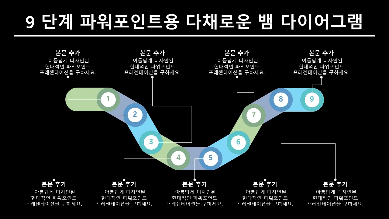 시각적으로 매력적인 이 PowerPoint 템플릿은 동적 뱀 스타일 레이아웃을 사용하여 청중에게 9단계 프로세스 또는 작업 흐름을 안내합니다. 전략적인 프레젠테이션에 적합하며 복잡한 시퀀스를 따라하기 쉬운 설명으로 단순화하는 데 도움이 됩니다. 다채롭고 세분화된 디자인은 기업 또는 교육 환경에 적합한 전문적인 미학을 유지하면서 각 단계에 주의를 집중시킵니다.
