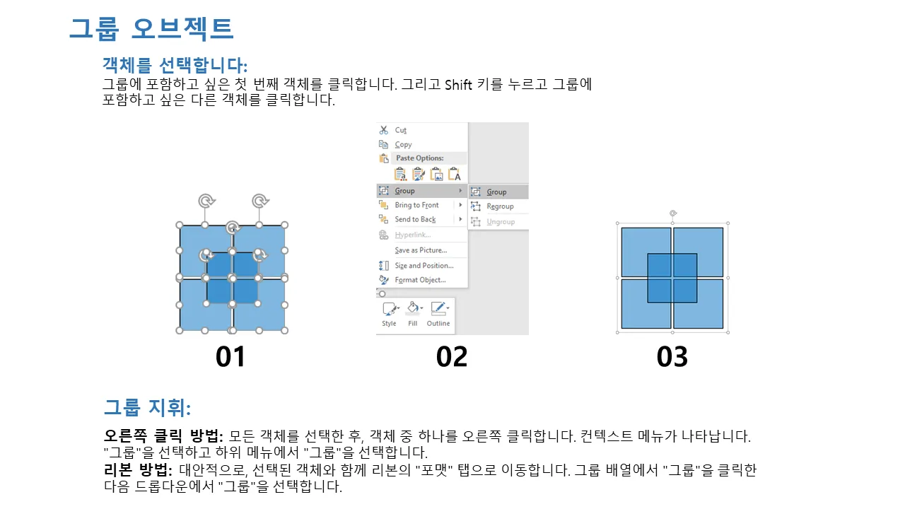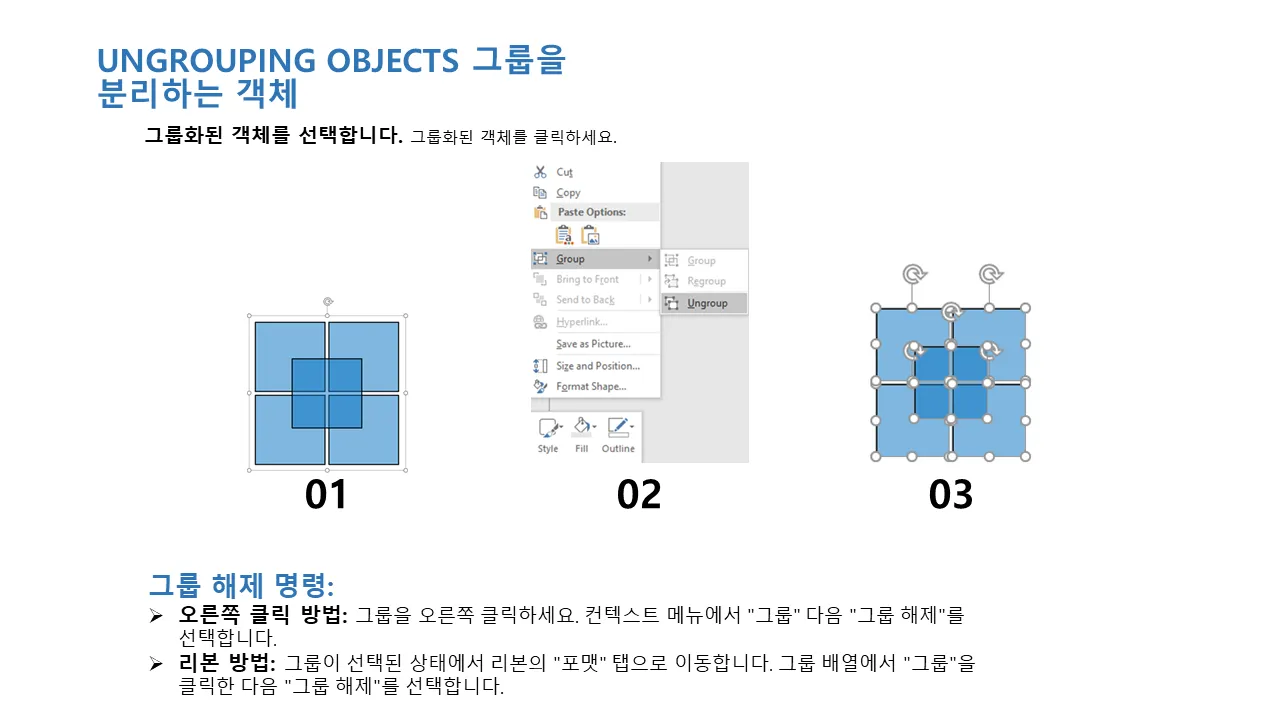 - 고급 슬라이드 조작을 위한 그룹화 및 그룹 해제 지침 포함